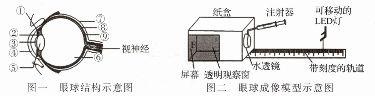 14. 某校八年级同学们利用水透镜和其他材料,制作了人体眼球成像模型(如图二)。请你观察模型,并结合眼球结构示意图(如图一),回答下列问题。