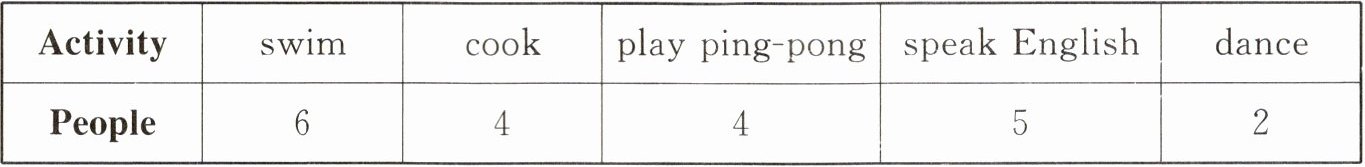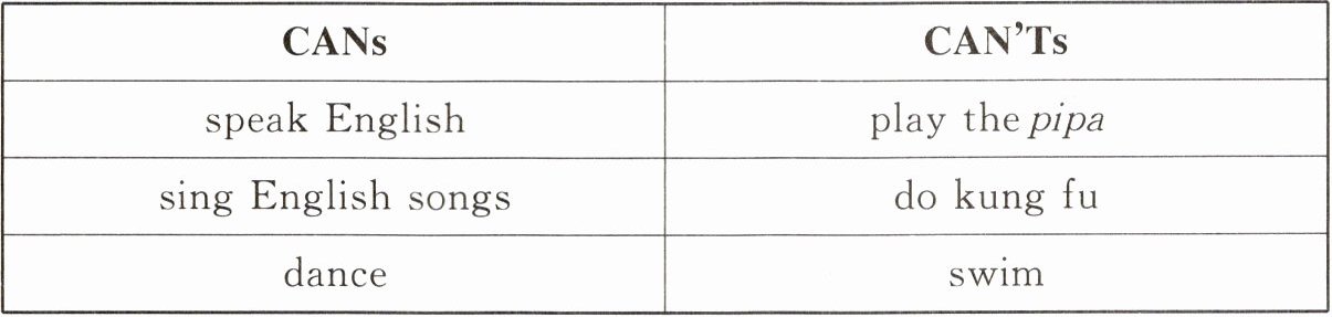 1.speak English 2.sing English songs 3.dance 4.play the pipa 5.do kung fu 6.swim
