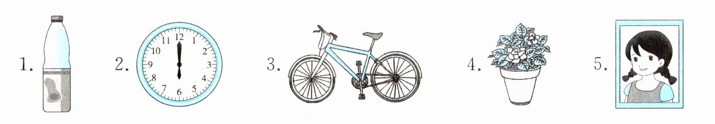 1.clock 2.plant 3.water bottle 4.photo/picture 5.bike