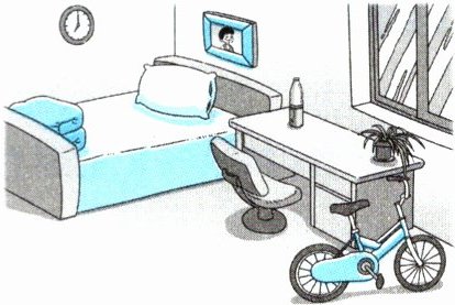 This is my room. There is a photo and a ______ on the wall. There is a ______ ______ on the desk. There is a ______ on it, too. There is a ______ near the desk. I ride it to school every day. Is my room nice? Tell me about your room, please!