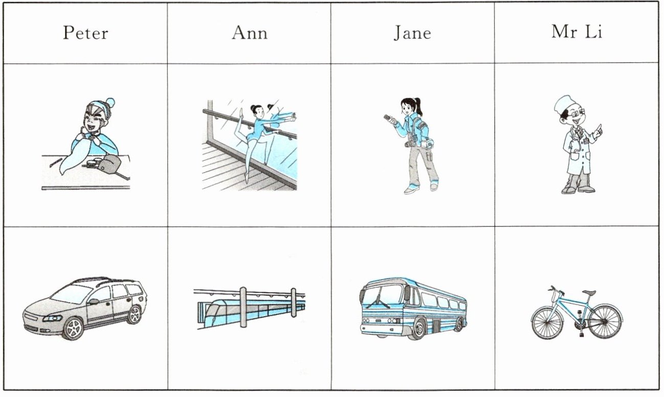1. Ann is a dancer. She goes to work by subway. 2. Jane is a reporter. She goes to work by bus. 3. Mr Li is a doctor. He goes to work by bike.