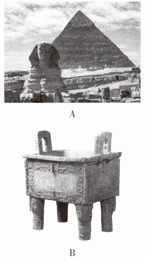 【示例】图A所代表的是古埃及文明。约从公元前3500年开始,在尼罗河下游陆续出现了若干个小国家;公元前3100年左右,古埃及初步实现了统一。金字塔是古埃及文明的象征,反映了古埃及社会经济发展的较高水平,是古埃及人智慧的结晶。雄伟的金字塔和威严的狮身人面像见证着它曾经的辉煌,木乃伊、法老的咒语增加了这个古老国度的神秘色彩。