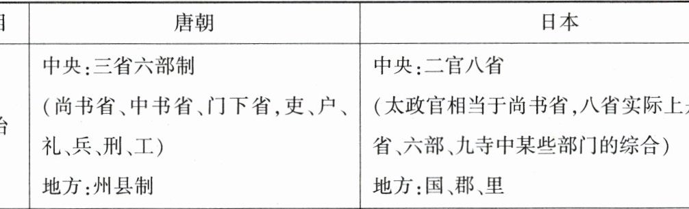 地方:州县制|中央:二官八省(太政官相当于尚书省,八省实际上是唐三省、六部、九寺中某些部门的综合)