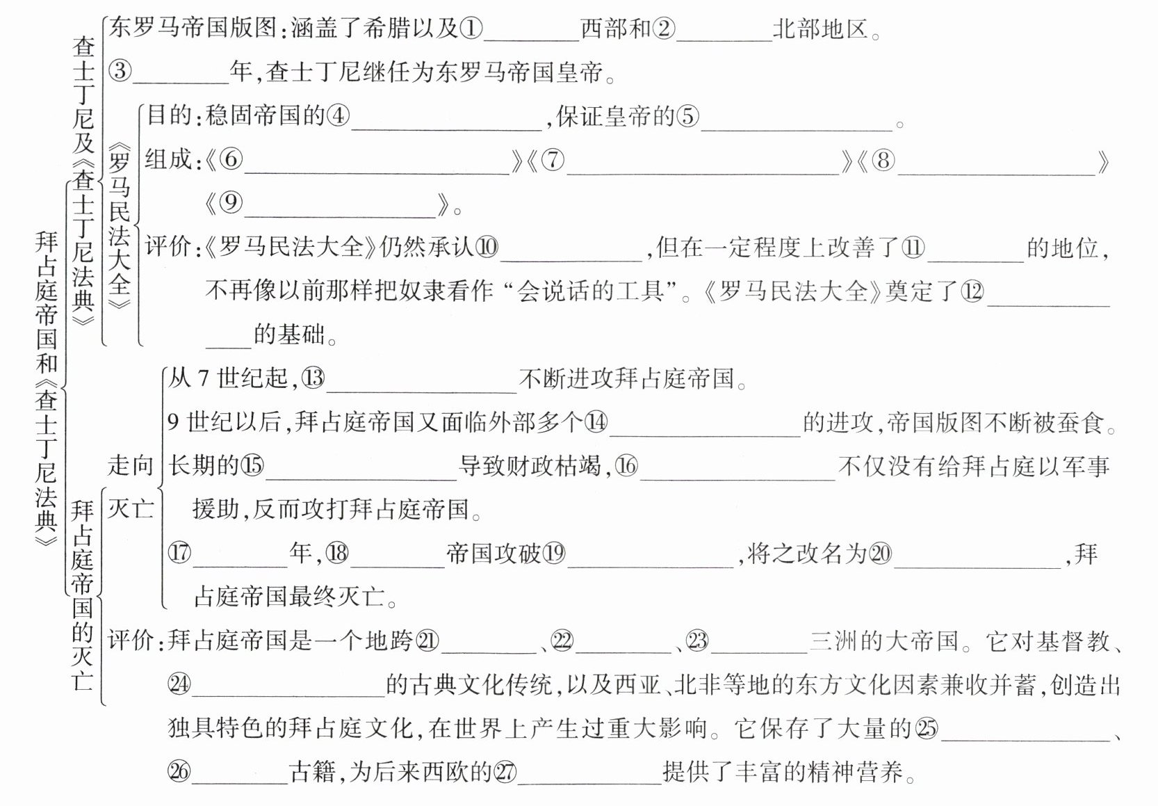 ①亚洲 ②非洲 ③527 ④社会秩序 ⑤专制权力 ⑥查士丁尼法典 ⑦法学汇纂 ⑧法理概要 ⑨新法典 ⑩奴隶制 ⑪奴隶 ⑫欧洲民法 ⑬阿拉伯人 ⑭军事势力 ⑮对外战争 ⑯十字军 ⑰1453 ⑱奥斯曼 ⑲君士坦丁堡 ⑳伊斯坦布尔 ㉑欧 ㉒亚 ㉓非 ㉔希腊罗马 ㉕希腊 ㉖罗马 ㉗文艺复兴