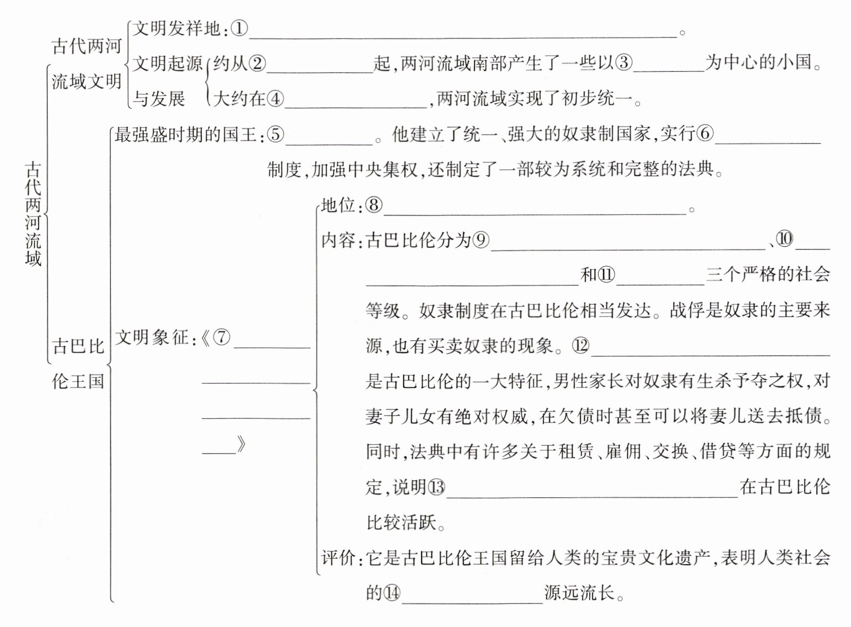 ①幼发拉底河与底格里斯河 ②公元前 3500 年 ③城市 ④公元前 24 世纪 ⑤汉谟拉比 ⑥君主专制 ⑦汉谟拉比法典 ⑧迄今已知世界上第一部较为完整的成文法典 ⑨拥有公民权的自由民 ⑩无公民权的自由民 ⑪奴隶 ⑫家庭奴隶制 ⑬商品经济 ⑭法制传统
