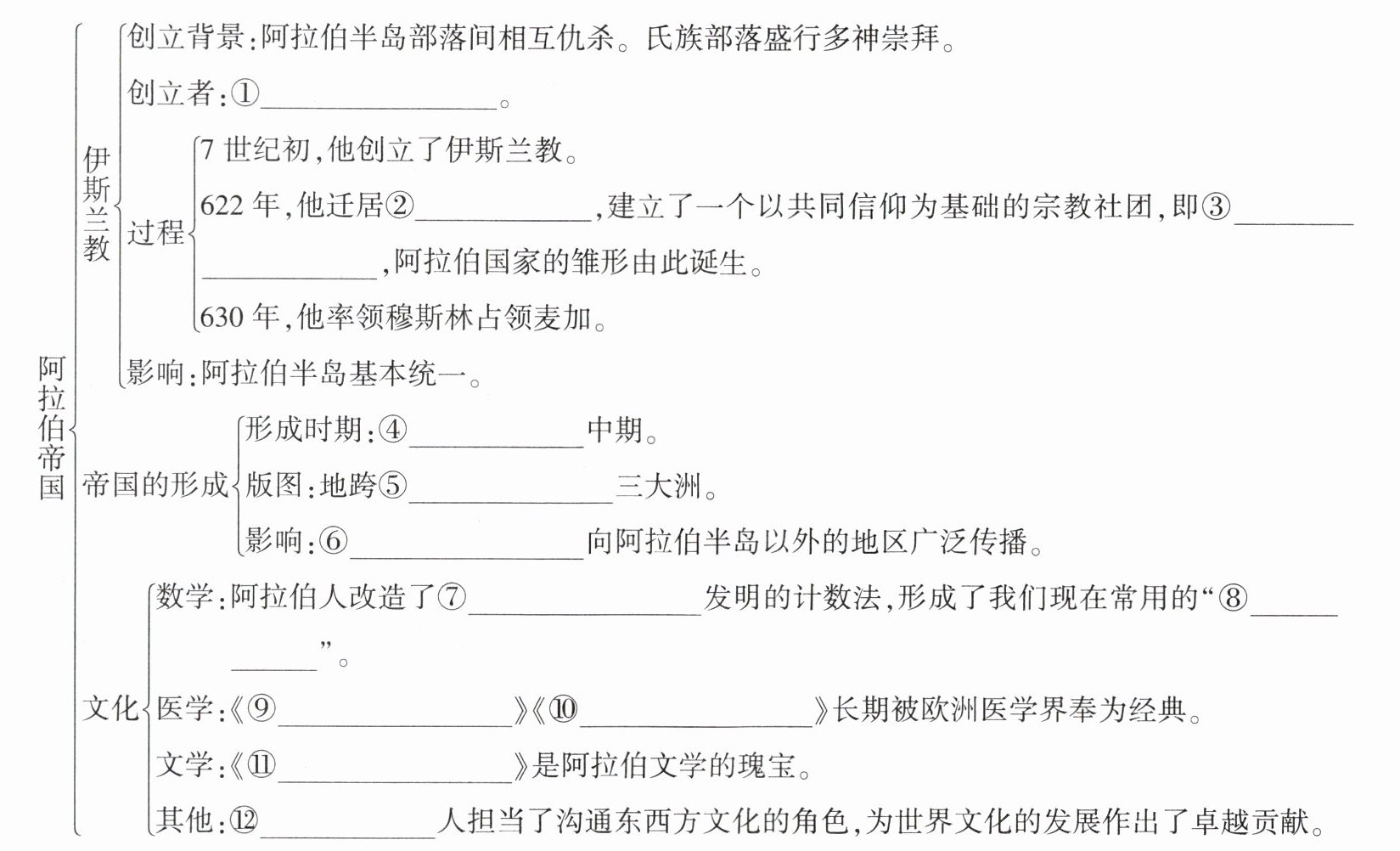 ①穆罕默德 ②麦地那 ③穆斯林公社 ④8 世纪 ⑤亚、欧、非 ⑥伊斯兰教 ⑦古印度人 ⑧阿拉伯数字 ⑨医学集成 ⑩医典 ⑪天方夜谭 ⑫阿拉伯