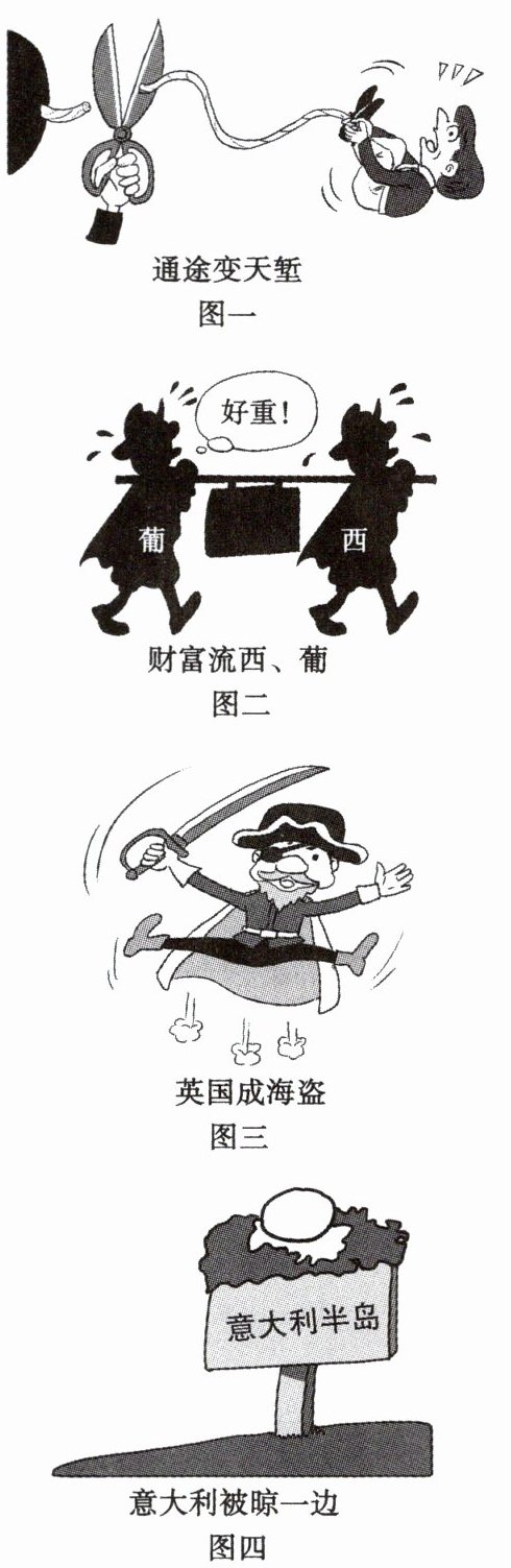 2. 阅读下面四幅反映新航路开辟前后相关史实的漫画,结合所学知识,回答问题。