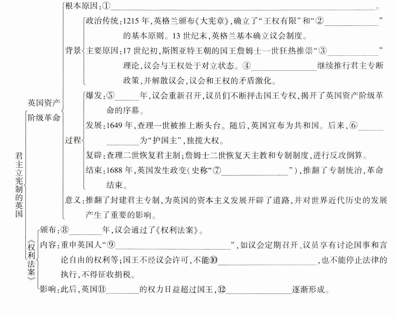 ①封建制度严重阻碍资本主义发展 ②王在法下 ③君权神授 ④查理一世 ⑤1640 ⑥克伦威尔 ⑦光荣革命 ⑧1689 ⑨自古就有的权利 ⑩随意废除法律 ⑪议会 ⑫君主立宪制