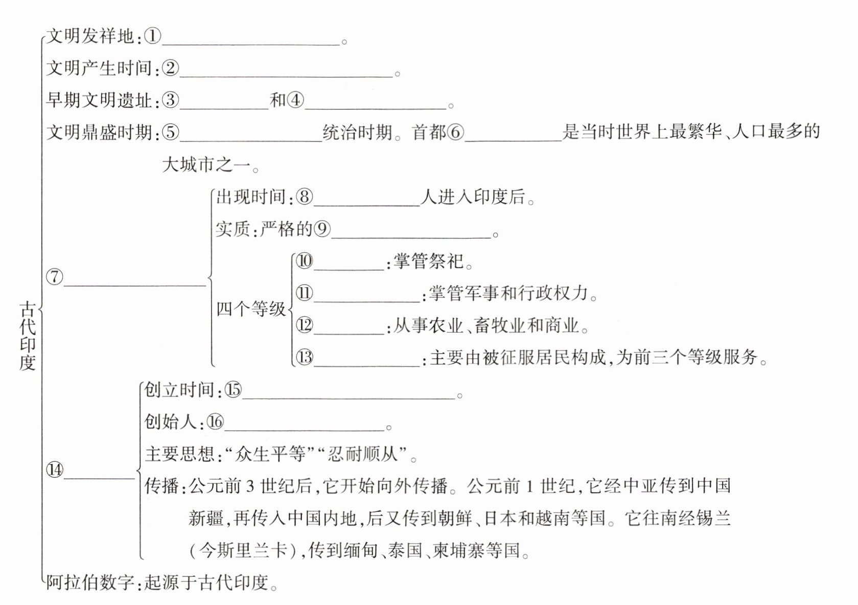 ①印度河流域 ②约公元前 23 世纪 ③哈拉帕 ④摩亨佐·达罗 ⑤孔雀王朝 ⑥华氏城 ⑦种姓制度 ⑧雅利安 ⑨社会等级制度 ⑩婆罗门 ⑪刹帝利 ⑫吠舍 ⑬首陀罗 ⑭佛教 ⑮公元前 6世纪 ⑯乔达摩·悉达多