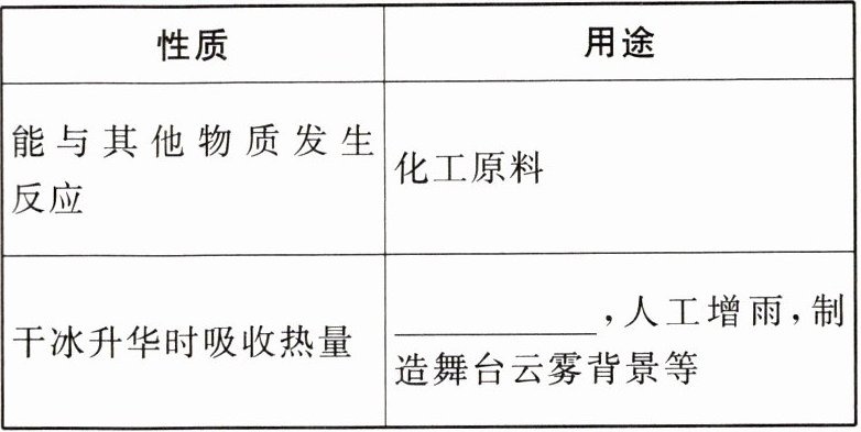 |干冰升华时吸收热量|______,人工增雨,制造舞台云雾背景等|