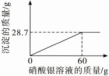 15. (10 分)实验室有一瓶标签被腐蚀的盐酸(含氯化氢和水)。某化学兴趣小组的同学为测定该盐酸中氯化氢的质量,取 50 g 此盐酸于烧杯中,然后加入硝酸银溶液(含硝酸银和水)。加入硝酸银溶液的质量与生成沉淀的质量关系如图所示。(已知:氯化氢与硝酸银反应的化学方程式为 AgNO_3 + HCl $\xlongequal{}$ AgCl↓ + HNO_3)