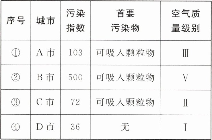|②|B市|500|可吸入颗粒物|Ⅴ|