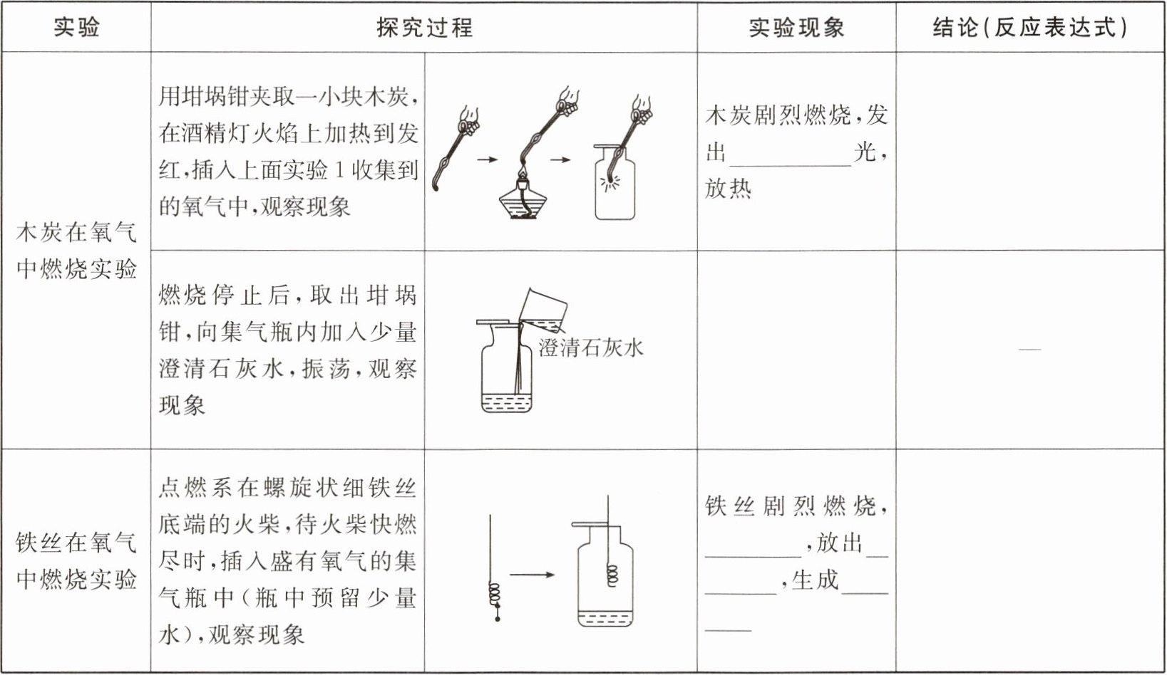 |木炭在氧气中燃烧实验|用坩埚钳夹取一小块木炭,在酒精灯火焰上加热到发红,插入上面实验 1 收集到的氧气中,观察现象|木炭剧烈燃烧,发出____光,放热|____|