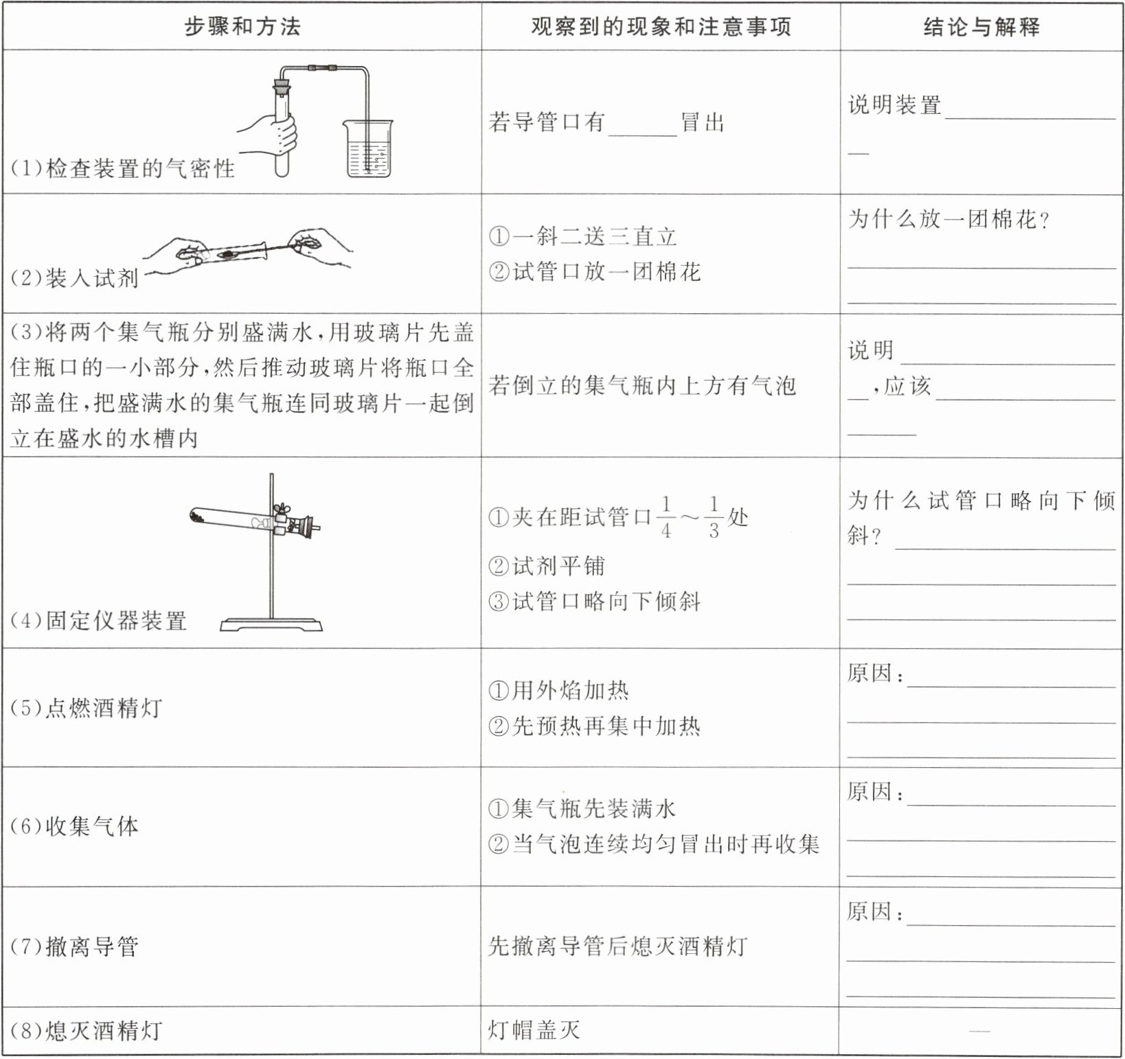 |(2)装入试剂|①一斜二送三直立②试管口放一团棉花|为什么放一团棉花?____|