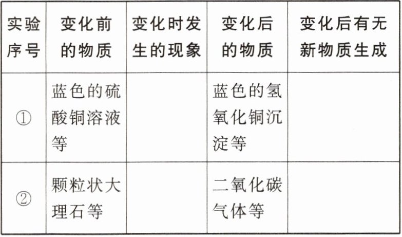 |实验序号|变化前的物质|变化时发生的现象|变化后的物质|变化后有无新物质生成|