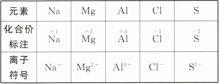 |化合价标注|$\overset{+1}{Na}$|$\overset{+2}{Mg}$|$\overset{+3}{Al}$|$\overset{-1}{Cl}$|$\overset{-2}{S}$|