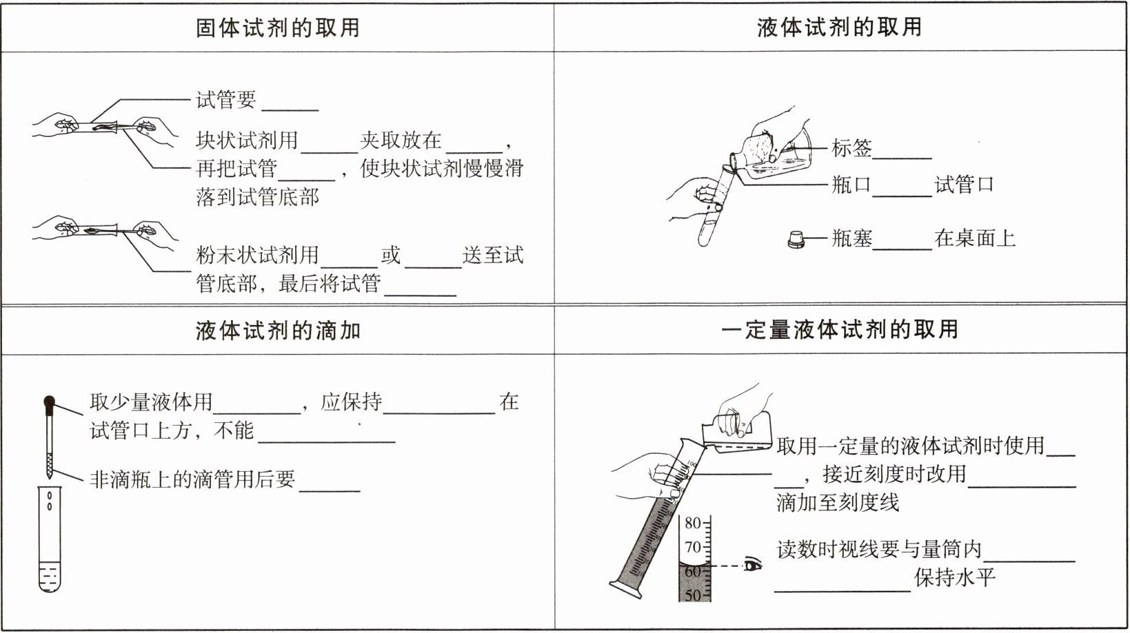 横放 镊子 试管口 慢慢竖立 药匙 纸槽 竖立起来 朝向手心 紧挨着 倒放 胶头滴管 胶头滴管伸入容器中 洗涤 量筒 胶头滴管 液体凹液面的最低处