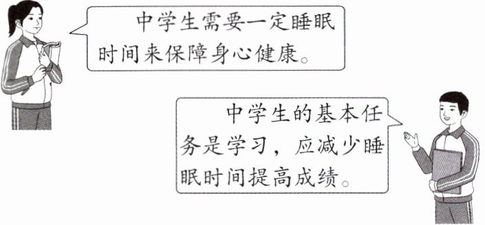 3. 教育部办公厅发布的《关于进一步加强中小学生睡眠管理工作的通知》要求,初中生每天睡眠时间应达到9小时。学校作息时间方面,中学上午上课时间一般不早于8:00,同时强调,学校不得要求学生提前到校参加统一的教育教学活动,有条件的地方和学校应保障学生必要的午休时间。就寝时间方面,初中生一般不晚于22:00。围绕着“睡眠时间”这个话题,两位同学发表了各自看法。
