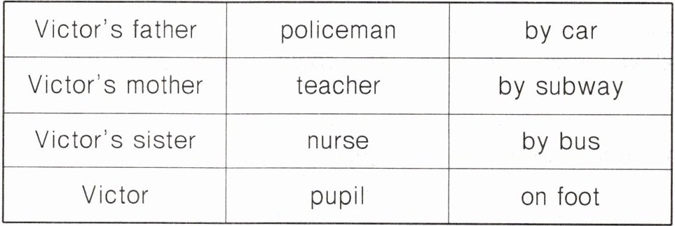 Hello,friends! My name is Victor. There are four people in my family. My father is a policeman. He works in a police station. It's far from our home. So he often goes to work by car. My mother is a teacher. She works at a school. It's not so far. So she usually goes to work by subway. My sister is a nurse. She goes to work by bus. I'm a pupil. My school is near. Usually I go to school on foot. I think it's good exercise.