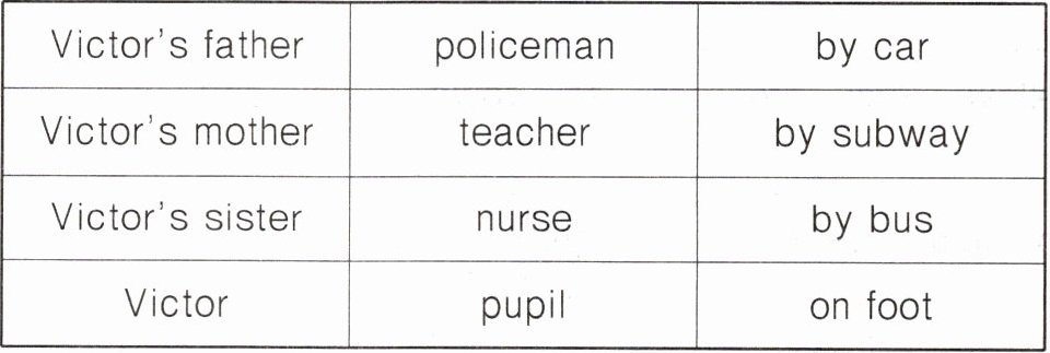 policeman. He works in a police station. It's far from our home. So he often goes to work by car. My mother is a teacher. She works at a school. It's not so far. So she usually goes to work by subway. My sister is a nurse. She goes to work by bus. I'm a pupil. My school is near. Usually I go to school on foot. I think it's good exercise.