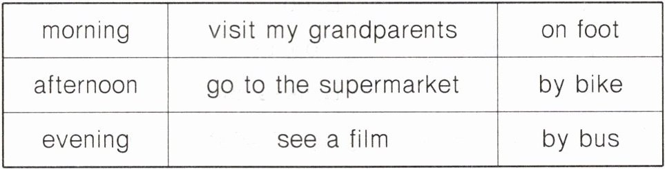 visit my grandparents in the morning. I'm going to my grandparents' home on foot. In the afternoon,I'm going to go to the supermar-ket. I'm going there by bike. In the evening,I'm going to see a film with my parents. We are going to the cinema by bus. It's really a busy day today.
