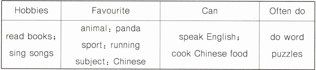 Hello! My name is Lin Lin. I want a pen pal. Do you want to be my pen pal? I like reading books and singing songs. My favourite animal is the panda. My favourite sport is running. And I like Chinese best. I can speak English. I can cook Chinese food, too. I often do word puzzles. What about you? Write to me and be friends!