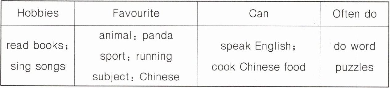 reading books and singing songs. My favourite animal is the panda. My favourite sport is running. And I like Chinese best. I can speak English. I can cook Chinese food, too. I often do word puzzles. What about you? Write to me and be friends!