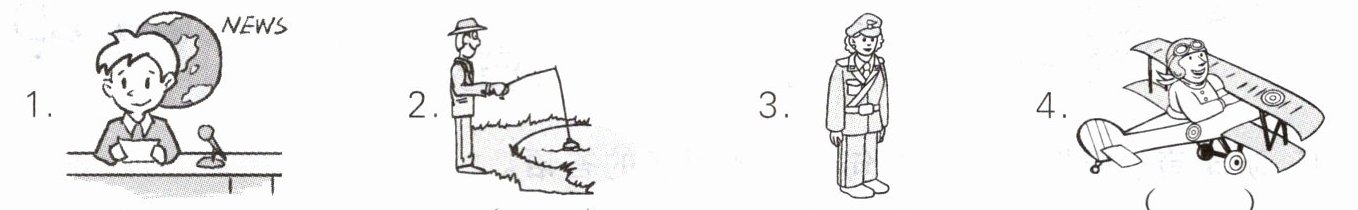 1.teacher 2.driver 3.businessman / businesswoman 4.scientist 5.fisher / fisherman 6.worker