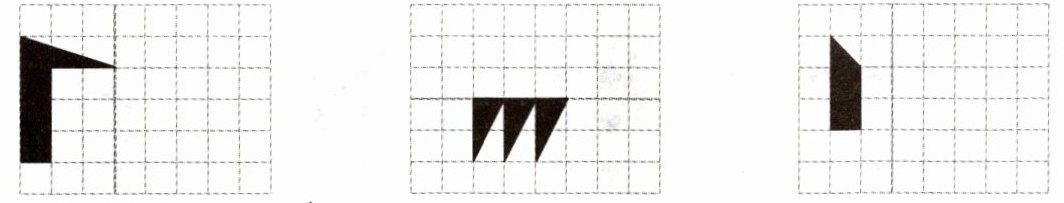 第三个图形:在对称轴左侧,从上到下:第一个格的左半部分(左边第一个小格)涂黑,第二个格的左半部分(左边第一个小格和第二个小格组成的矩形的一半,即左半部分的小三角形对应的对称部分,这里本身已在左侧无需再对称涂黑,但从整体图形对称角度看,左侧已有对应形状)实际作答时只需保证右侧对称部分与左侧形状关于对称轴对称,即右侧第一个格的右半部分(右边第一个小格的右上部分)不涂黑,右侧第一个格的左半部分(右边第一个小格的左上三角形对应的对称部分,即左半部分小三角形)涂黑。更准确描述为:在对称轴左侧已有一个直角三角形,其直角在左上角,要画出关于对称轴对称的图形,则在右侧应画一个直角在右上角的直角三角形,且大小与左侧直角三角形相同。