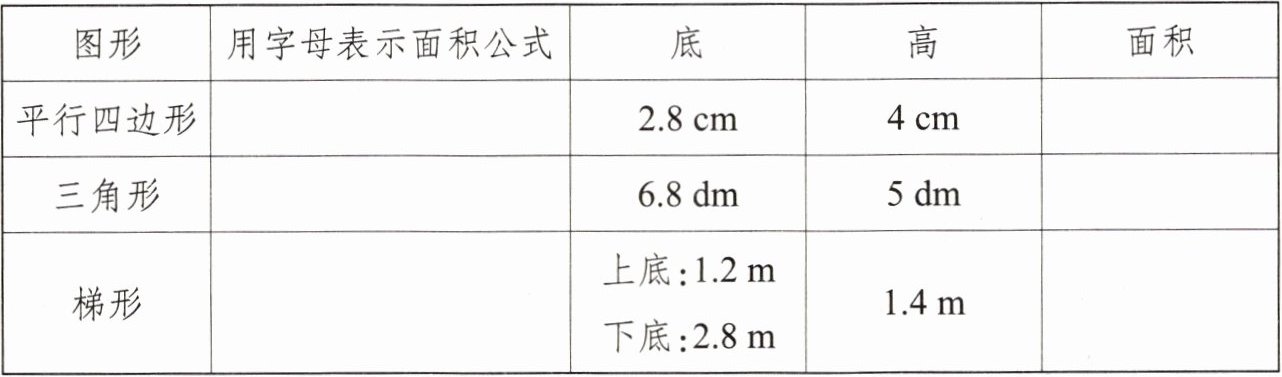 $ S=ah $ $ 11.2\ cm^2 $ $ S=ah÷2 $ $ 17\ dm^2 $ $ S=(a+b)h÷2 $ $ 2.8\ m^2 $