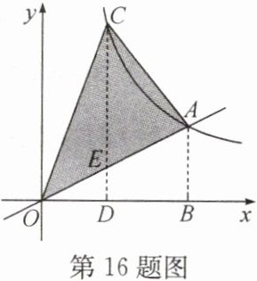16. 如图所示,已知直线 $ y = \frac{1}{2}x $ 与双曲线 $ y = \frac{k}{x}(k > 0) $ 交于点 $ A $,且点 $ A $ 的横坐标为 $ 4 $.