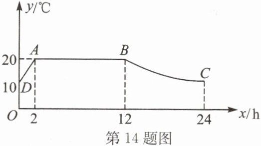 14. 我市某蔬菜生产基地用装有恒温系统的大棚栽培一种生长温度为 $ 15^{\circ}C \sim 20^{\circ}C $ 的新品种,如图是某天恒温系统从开启到关闭及关闭后,大棚里温度 $ y(^{\circ}C) $ 随时间 $ x(h) $ 变化的函数图象,其中 $ AB $ 段是恒温阶段,$ BC $ 段是双曲线 $ y = \frac{k}{x} $ 的一部分. 请根据图中信息解答下列问题: