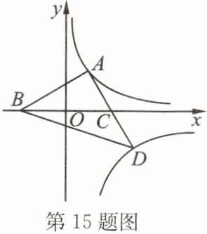 15. 如图,在平面直角坐标系中,$ Rt \triangle ABC $ 的斜边 $ BC $ 在 $ x $ 轴上,坐标原点是 $ BC $ 的中点,$ \angle ABC = 30^{\circ} $,$ BC = 4 $,双曲线 $ y = \frac{k}{x} $ 经过点 $ A $.