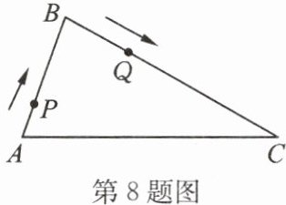 8. 如图,在$\triangle ABC$中,$AB = 8\ cm$,$BC = 16\ cm$,点$P从A开始沿AB边向点B以2\ cm/s$的速度运动,点$Q从点B开始沿BC边向点C以4\ cm/s$的速度运动. 如果$P$,$Q分别从A$,$B$同时出发,那么经过多长时间,以$P$,$Q$,$B为顶点的三角形与\triangle ABC$相似?