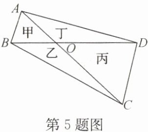 5. 如图,不等长的两条对角线$AC$,$BD相交于O$点,且将四边形$ABCD$分成甲、乙、丙、丁四个三角形. 若$OA:OC = OB:OD = 1:2$,则此四个三角形的关系,下列叙述正确的是(