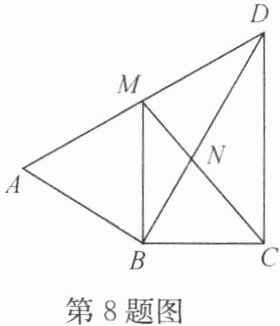 8. 如图,$ \angle ABD = \angle BCD = 90^{\circ} $,$ DB $ 平分 $ \angle ADC $,过点 $ B $ 作 $ BM // CD $ 交 $ AD $ 于点 $ M $。连接 $ CM $ 交 $ DB $ 于点 $ N $。