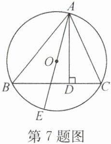 7. 如图所示,$ \odot O $ 是 $ \triangle ABC $ 的外接圆,$ AE $ 是直径,$ AD $ 是 $ BC $ 边上的高,求证:$ AB \cdot AC = AE \cdot AD $。