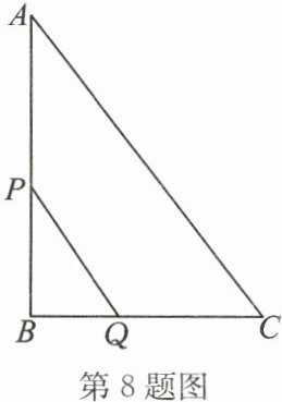 8. 如图,$Rt△ABC$ 中,$∠B = 90°$,$AC = 10$ cm,$BC = 6$ cm,现有两个动点 $P$,$Q$ 分别从点 $A$ 和点 $B$ 同时出发,其中点 $P$ 以 2 cm/s 的速度,沿 $AB$ 向终点 $B$ 移动;点 $Q$ 以 1 cm/s 的速度沿 $BC$ 向终点 $C$ 移动,其中一点到达终点,另一点也随之停止。连接 $PQ$。设动点运动时间为 $x$ s。