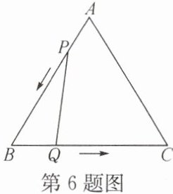 6. 如图所示,$ \triangle ABC 是边长为 3 cm $的等边三角形,动点$ P $,$ Q 同时从 A $,$ B $两点出发,分别沿$ AB $,$ BC $方向匀速移动,它们的速度都是$ 1 cm/s $,当点$ P 到达点 B $时,$ P $,$ Q $两点停止运动. 设点$ P 的运动时间为 t(s) $,解答下列问题: