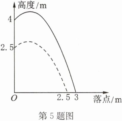 5. 如图,水池中心点 $ O $ 处竖直安装一水管,水管喷头喷出抛物线形水柱,喷头上下移动时,抛物线形水柱随之竖直上下平移,水柱落点与点 $ O $ 在同一水平面。安装师傅调试发现,喷头高 $ 2.5m $ 时,水柱落点距 $ O $ 点 $ 2.5m $;喷头高 $ 4m $ 时,水柱落点距 $ O $ 点 $ 3m $。试求水柱落点距 $ O $ 点 $ 4m $ 时的喷头高度。