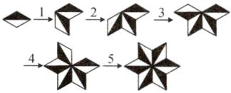 2 如图所示,请将菱形以黑色等腰三角形底角顶点$P$为旋转中心,依次顺时针旋转$60^{\circ}$,$120^{\circ}$,$180^{\circ}$,…$$,直至与开始图形重合,试画出旋转过程中的图案。【思路导析】以黑色等腰三角形底角顶点$P$为中心,依次顺时针旋转$60^{\circ}$,$120^{\circ}$,$180^{\circ}$,$240^{\circ}$,$300^{\circ}$即可。