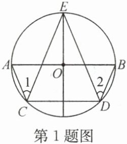 1. 如图,$ AB $ 是 $ \odot O $ 的直径,$ C $,$ D $,$ E $ 都是 $ \odot O $ 上的点,则 $ \angle 1 + \angle 2 = $