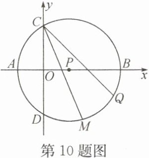 10. 如图,在平面直角坐标系中,⊙P与x轴交于A,B两点,交y轴于点C,D。Q为$\overset{\frown}{BD}$上一动点,CM平分∠QCD,若A(-2,0),P(2,0)。