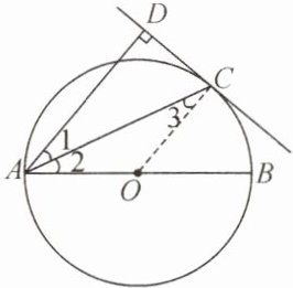 3 如图,AB为⊙O的直径,C为⊙O上的一点. 若∠BAC= ∠CAD,且CD⊥AD于点D,试探究CD与⊙O的位置关系.