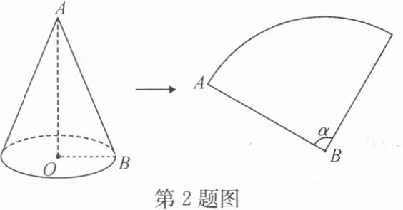 2. 如图,圆锥的底面半径 $ O B $ 为 $ 8 \mathrm{cm} $,它的展开图是半径为 $ 20 \mathrm{cm} $ 的扇形,则这个扇形的圆心角 $ \alpha $ 的度数为