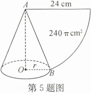 5. 如图,小明用一个半径为 $ 24 \mathrm{cm} $,面积为 $ 240 \pi \mathrm{cm}^{2} $ 的扇形纸板,制作一个圆锥形的玩具帽,求帽子的底面半径 $ r $。