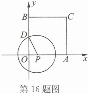 16. 如图,正方形 AOBC 的顶点 O 在原点,边 AO,BO 分别在 x 轴和 y 轴上,点 C 的坐标为 $(4,4)$,D 是 BO 的中点,P 是边 OA 上的一个动点,连接 PD,以 P 为圆心,PD 为半径作圆,设点 P 的横坐标为 t,当⊙P 与正方形 AOBC 的边相切时,求 t 的值.