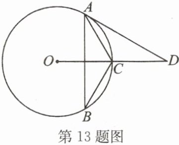 13. 如图,在⊙O 中,C 为 $\overset{\frown}{AB}$ 的中点,$\angle ACB = 120^{\circ}$,AD 是⊙O 的切线,OC 的延长线与 AD 交于点 D.