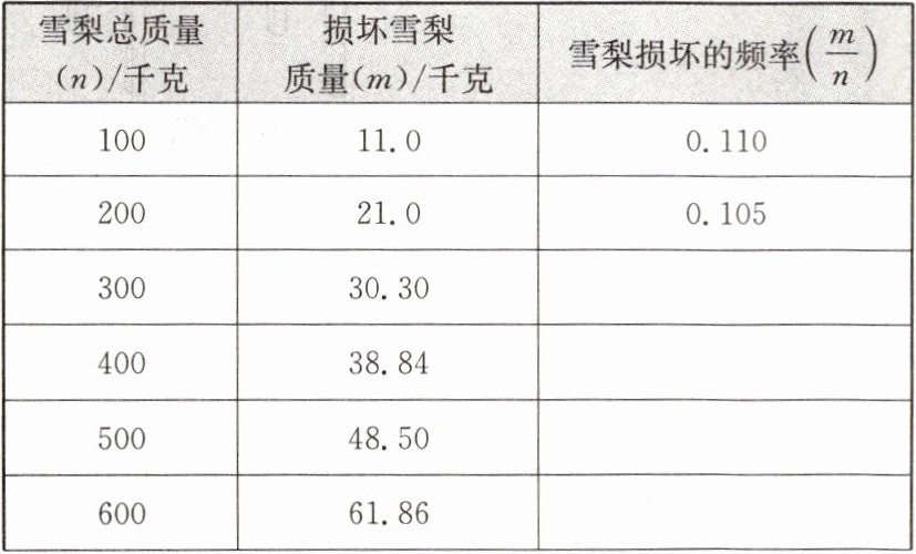 (2)从表中可以看出,雪梨损坏的频率在常数 0.1 左右摆动,并且随统计量的增加这种规律逐渐明显,那么可以把雪梨损坏的概率估计为这个常数,即雪梨损坏的概率为 0.1,则相应完好的雪梨的概率为 0.9.