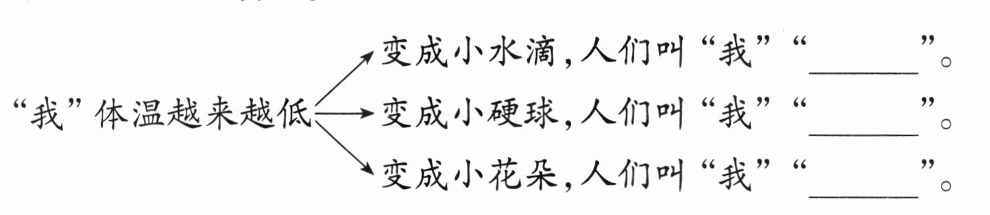 我在空中越升越高,体温越来越低,变成了无数小水滴。小水滴聚在一起( )下来,人们叫我“雨”。有时候我变成小硬球( )下来,人们就叫我“冰雹”。到了冬天,我变成小花朵( )下来,人们又叫我“雪”。